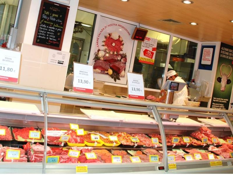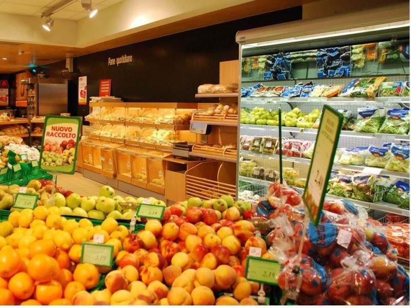 Supermercato con banco macelleria tradizionale, banco salumi-formaggi-gastronomia, pane self-service, reparto ortofrutta self service, detersivo sfuso, per un totale di 750 metri quadrati di vendita.